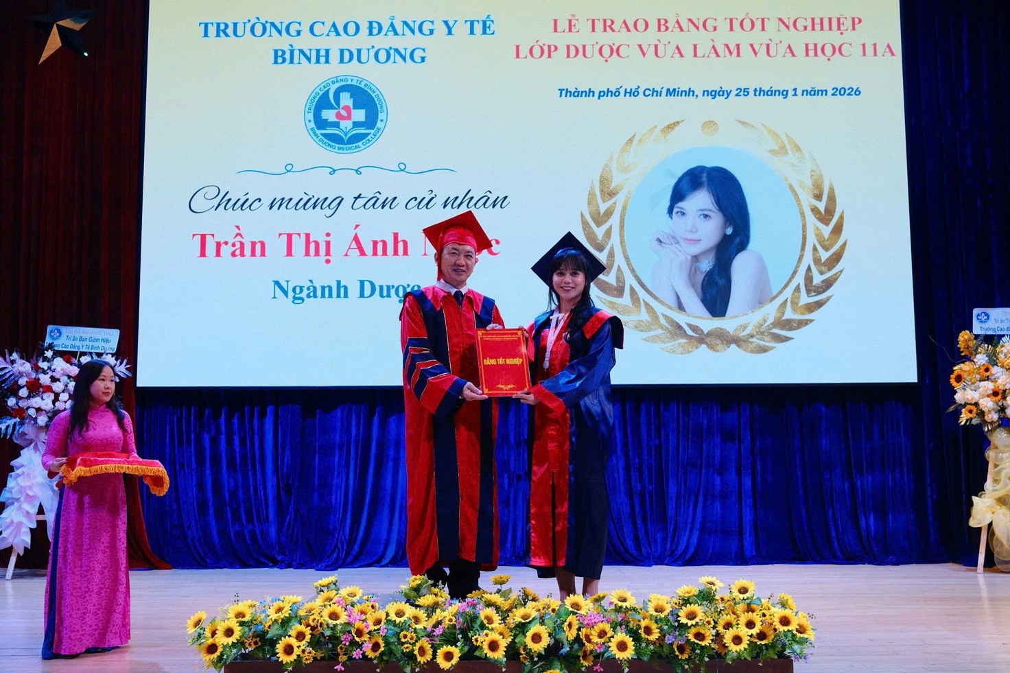 Hình 2: Ban Giám hiệu Trường Cao đẳng Y tế Bình Dương trao bằng tốt nghiệp cho tân cử nhân